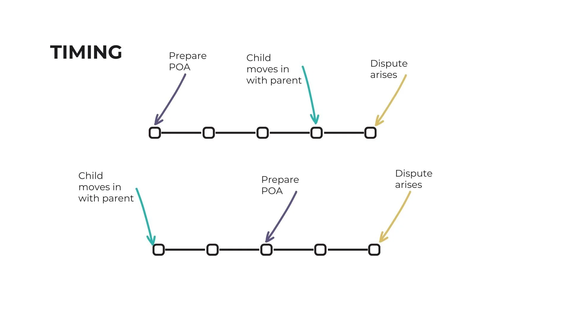 The timing of the abuse, or the problem, will impact what the appropriate response is. If you look at the above slide, if the child is already living with the parent then this is something that you can discuss at your initial consultation, and provide some advice. You can even structure your document and your appointment to try to avoid duress. However, if the adult child does not move in with the parent until after preparation of the Power of Attorney, particularly in circumstances where the client insists that they won’t have a child come and live with them, then how can we protect a client from that risk. Can we protect a client from that risk? I think that we can, though it involves having more than a peripheral conversation about aging and medical needs.