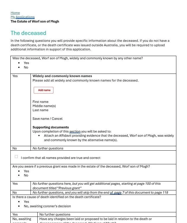 Have you ever started an online Probate application, only to realise that you are missing a piece of information that you need? I have created a precedent that has all of the questions and answers so that you can read through it and figure out what you need in one hit, rather than figuring it out one step at a time. It is 160 pages long, with an index and headings saved as navigation points, to help you to get a summary of what you need for every matter, at the beginning, without having to upload blank documents or enter partially complete answers to advance to the next page and next set of requirements.