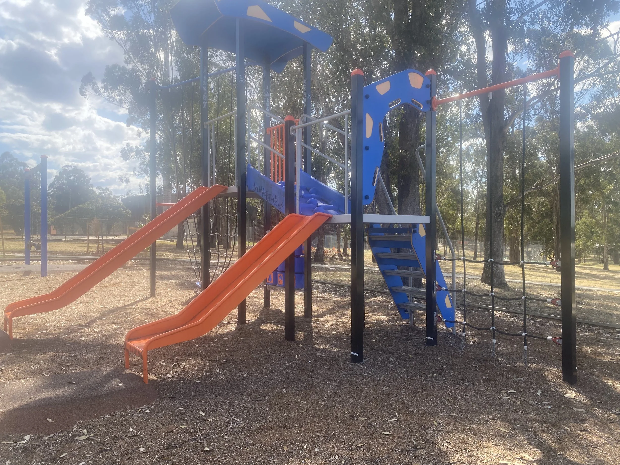 It is surrounded by trees and next to a large water reservoir, so while it isn’t always in the shade it is quite cool even on a hot day. There are two slides, two cargo nets, two slides and a merry-go-round. There are big sandstone blocks around part of the park so there is always somewhere for the adults to sit. It is on Glebe Place in Kingswood, but in the very pointy top part of Kingswood that most people in Penrith would probably think was Cambridge Park.